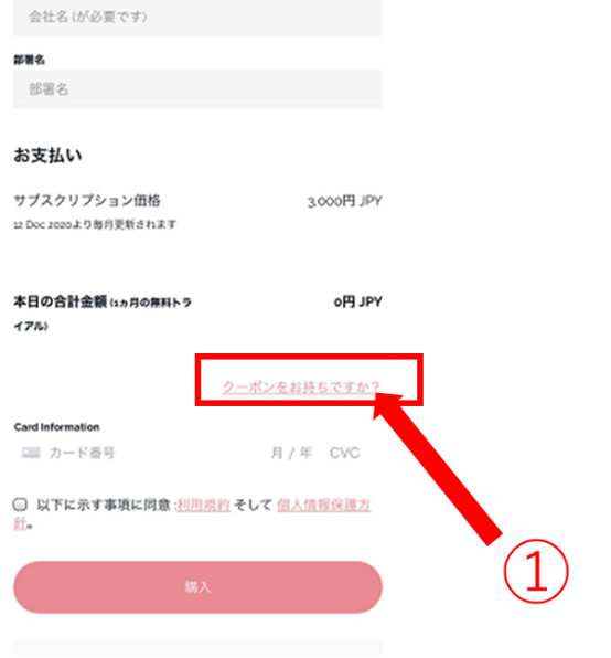 ①購入手続きページの「クーポンをお持ちですか?」をクリックしてください。